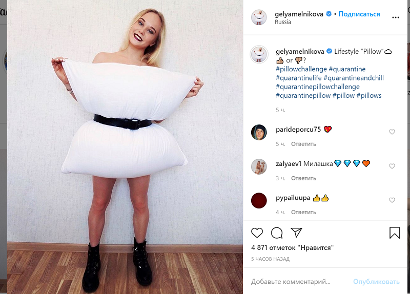 В настоящее время из-за угрозы распространения новой коронавирусной инфекции практически во всех регионах России введен режим самоизоляции. Люди обязаны находиться дома и без острой необходимости его не покидать. Поэтому, чтобы хоть как-то себя развлечь они придумали новый челлендж, который стал очень популярен среди пользователей Instagram. Называется он – «карантинный» или PillowChallenge. Его основная идея – прикрывать тело подушкой, подвязав ее поясом или ремнем, чтобы получилось «уютное» и объемное платье.