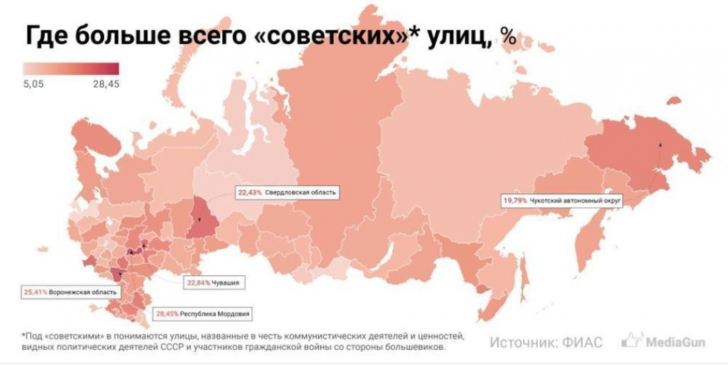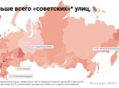 - Советская власть внесла свои коррективы в названия улиц. Многие были переименованы, в XX веке улицам, проспектам и шоссе присваивали названия коммунистических деятелей и ценностей: Ленина, Красная, Пятилеток и прочие. По ключевым словам мы выделили такие улицы (12,% от общего числа) из общего списка и сделали карту регионов по уровню «советизации», - отмечают в агентстве дата-журналистики Mediagun Post.