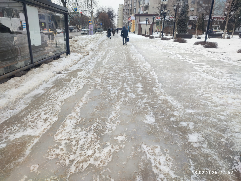 Вчера решил снова сходить на место, где упал. То, что предстало моему взору, не поддается описанию цензурным языком. Осадки закончились позавчера, а тротуар и остановка в самом центре города на одной из главных улиц, недалеко от площади Ленина и областного правительства, полностью во льду, даже песком не посыпаны. Сколько тут народу уже упало, страшно даже подумать.