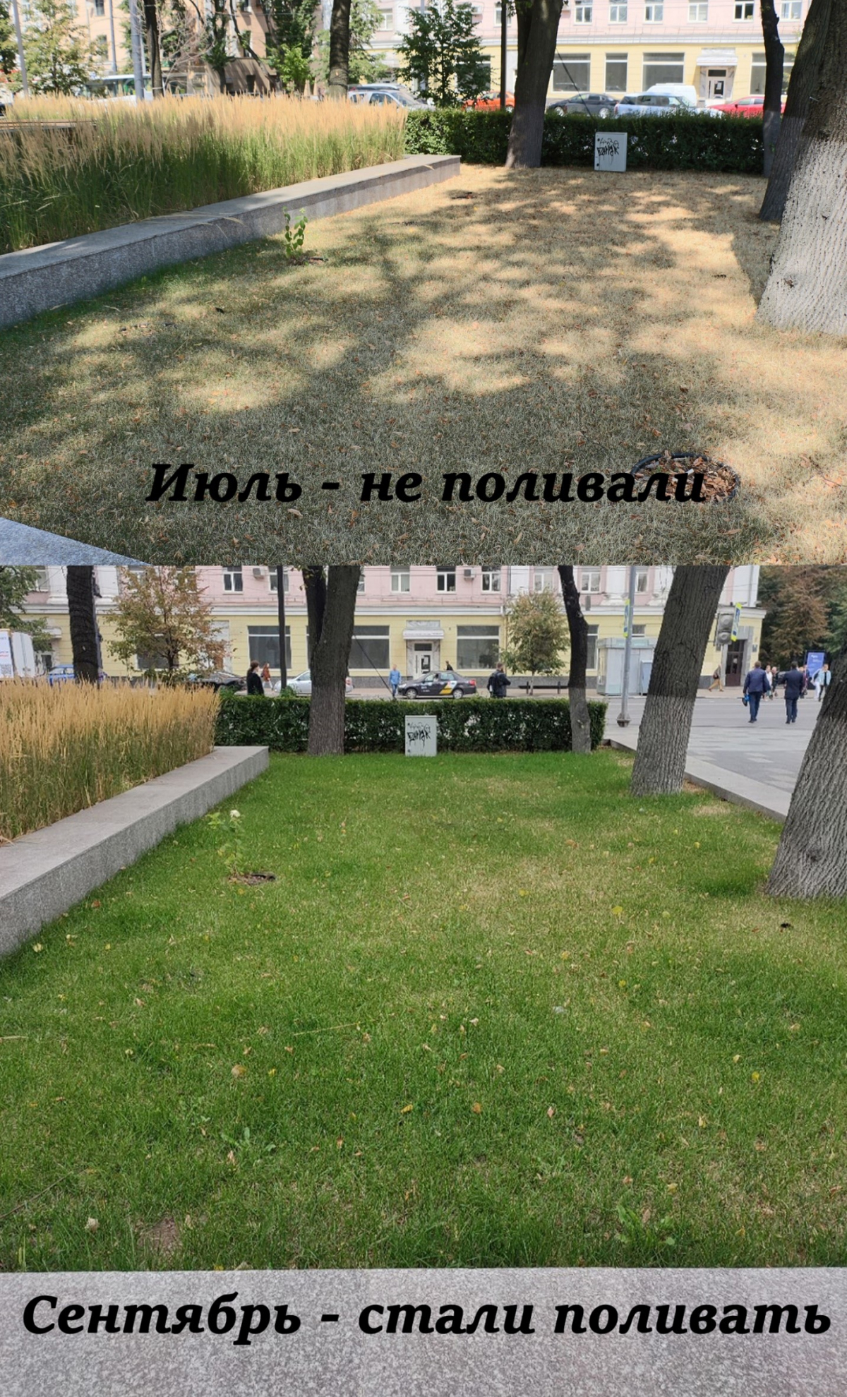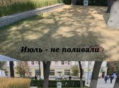 Однако в июле (а по-хорошему, еще в июне) стало понятно, что сквер засыхает – газон, растения и деревья просто не выдерживают жары и засухи. Тогда городская администрация сказала, что она поливала сквер, но жара оказалась сильнее – с учетом того, что земля в сквере всегда была сухая, верится в это с трудом. После публичного скандала мэрия все-таки стала поливать сквер.