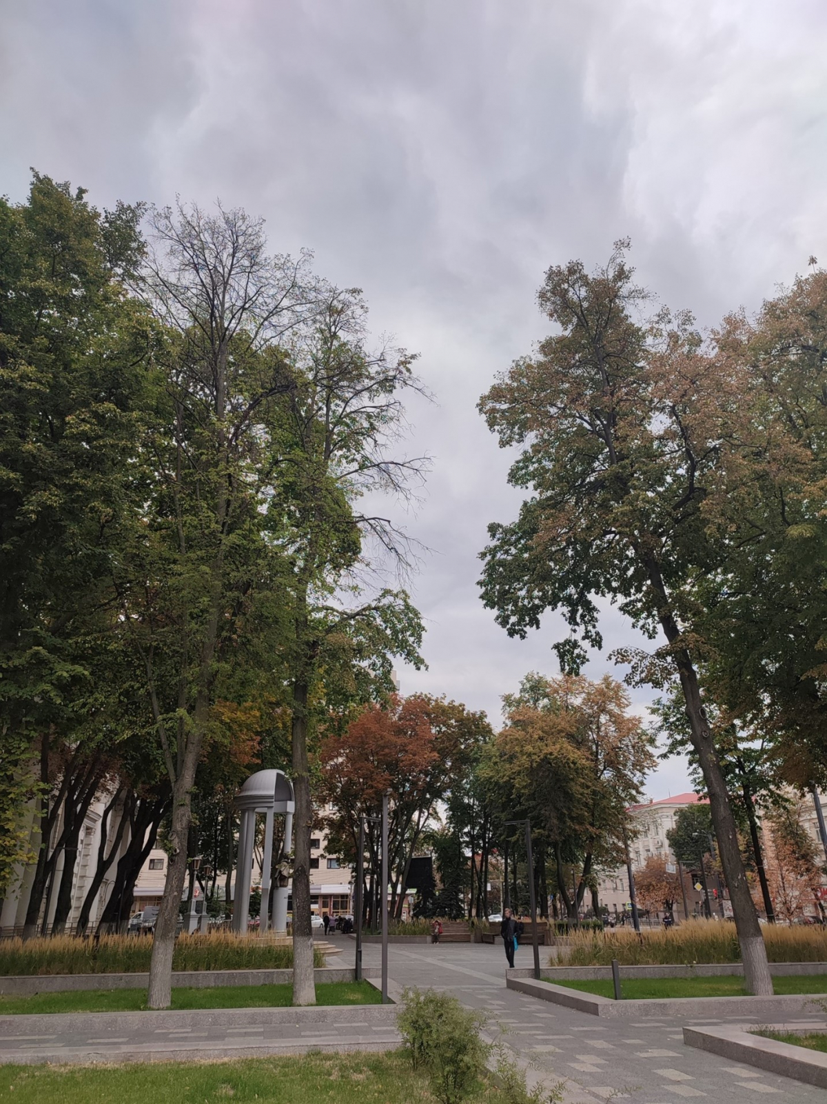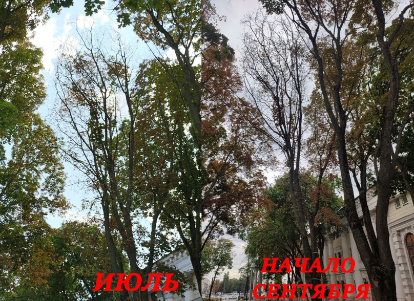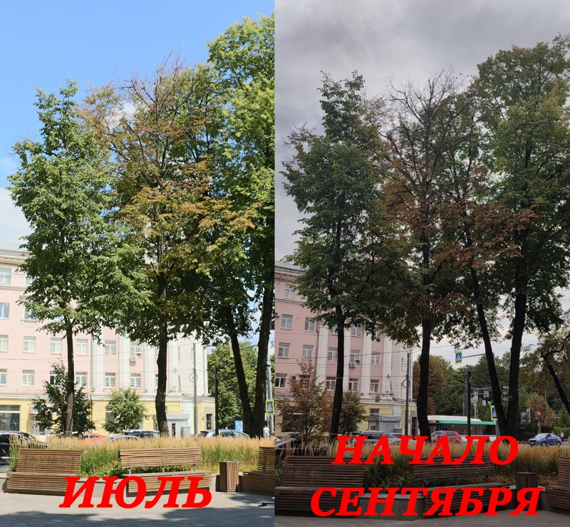 Нужно ли говорить, что и в июле, и в начале сентября здоровые деревья должны стоять зеленые и с пышной кроной (посмотрите на Кольцовский сквер через дорогу), а не как в Пушкинском сквере.