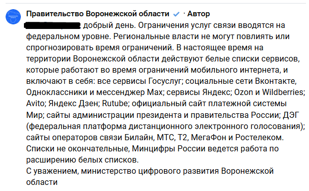 Воронежцам напомнили о существовании белого списка, куда входят сервисы, способные работать даже во время ограничений мобильного интернета. Это Госуслуг, «Вконтакте», «Одноклассники», Max, «Яндекс», Ozon, Wildberries, Avito; Яндекс Дзен; Rutube; официальный сайт платежной системы Мир; сайты администрации президента и правительства России; ДЭГ, сайты операторов связи.
