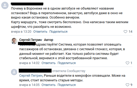 Сергей Петрин ответил: «Система, которая позволяет оповещать пассажиров об остановках, увязана с системой глонасс, которая, в данный момент не работает. Как только работа системы будет стабильной, вернемся к этой востребованной практике».
