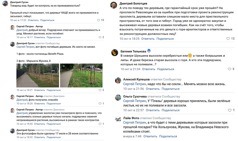 Кто-то даже присылал фото засохших молодых деревьев. Сергей Петрин пояснил, что эти деревья только недавно высадили, в октябре, и все, которые засохли, позднее заменит подрядчик, но житель пояснил, что фотографировал их летом. Неловкий момент.