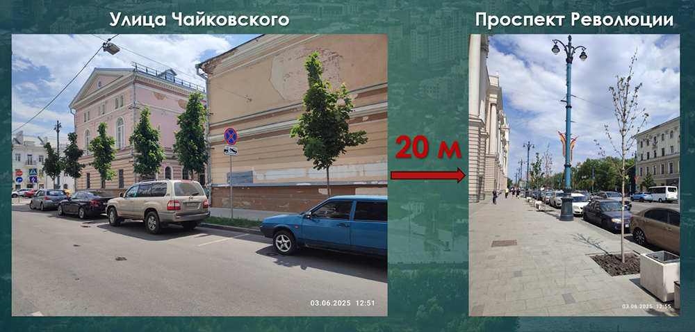 Посмотрите, как себя чувствуют одни и те же клены, посаженные в одно время: в газоне на улице Чайковского и в квадратиках на проспекте Революции, хотя расстояние между ними всего пара десятков метров.