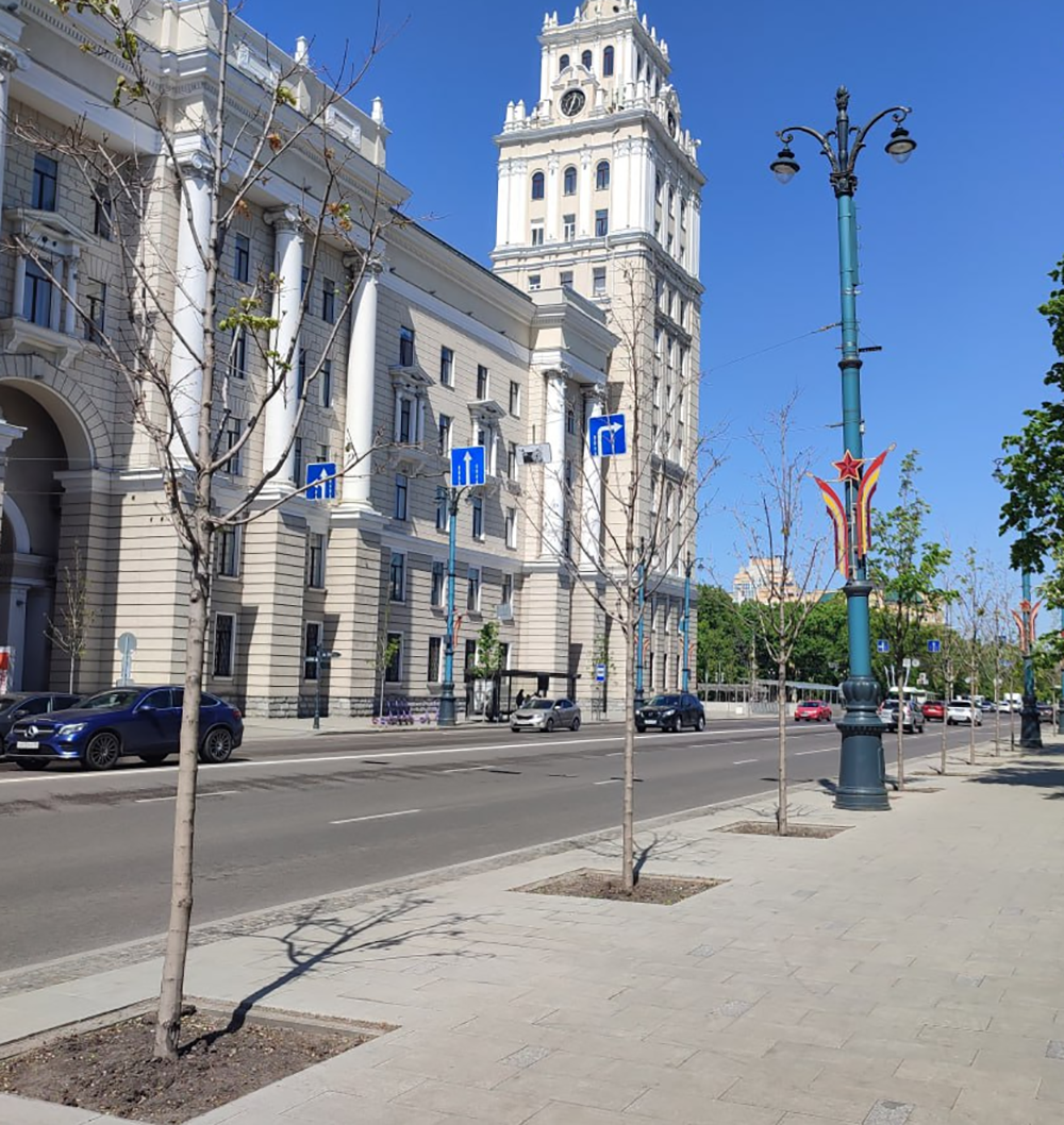 1) Любому зеленому насаждению должно быть достаточно жизненного пространства, то есть открытого грунта. И дело здесь не только в поступлении влаги для корневой системы, но и в температуре – твёрдое покрытие (плитка, асфальт и т.д.) сильно нагревается в жару на солнце, что очень негативно сказывается на корневой системе. Самый яркий пример, почему нельзя сажать деревья в квадратики, – проспект Революции.