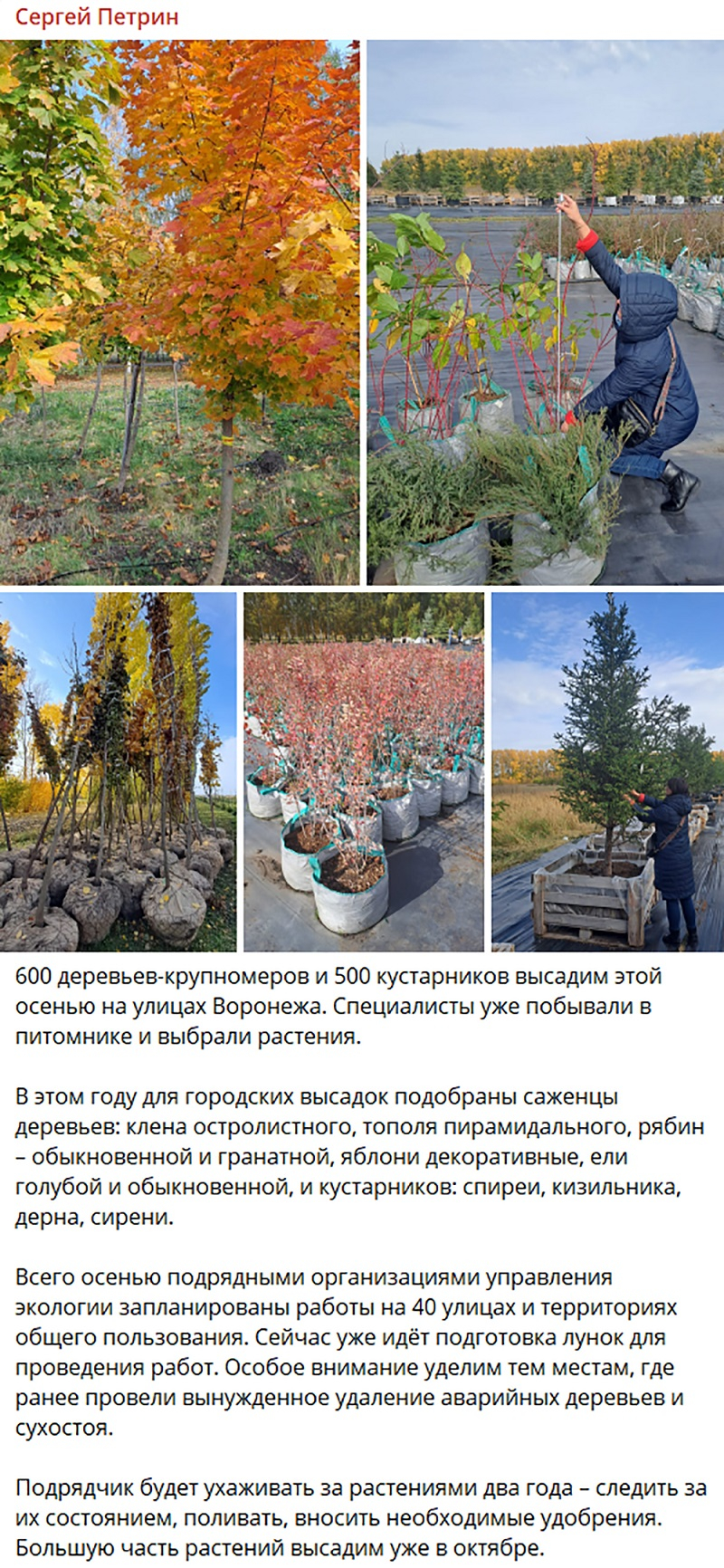 В конце прошлой рабочей недели глава городской администрации Сергей Петрин анонсировал осеннее озеленение Воронежа: «600 деревьев-крупномеров и 500 кустарников высадим этой осенью на улицах Воронежа».