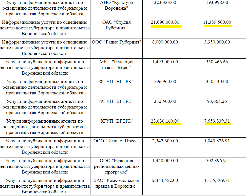 - 37,6 млн. рублей получили из бюджета региональные и федеральные СМИ за 6 месяцев 2016 г. за свои услуги "по информации о деятельности губернатора и правительства Воронежской области". Самый "жирный кусок" - почти 7,7 млн рублей - достался ФГУП "ВГТРК", - по году получат 23,6 млн. рублей.