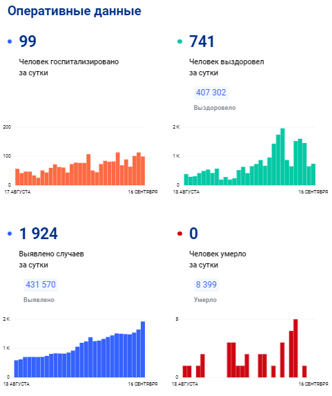 16 сентября стало известно о новых заболевших COVID-19. За минувшие сутки положительный тест на коронавирус получили 1 924 человека. Накануне болезнь подтвердилась у 1 648 местных жителей. Всего ковид был выявлен у 431 570 граждан на территории региона.