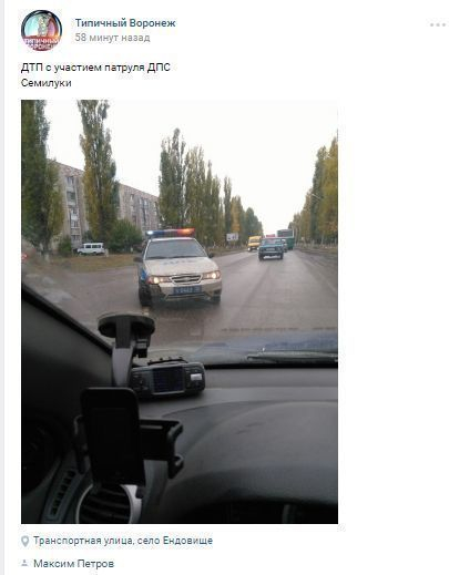 12 октября в популярном воронежском сообществе появилась запись об очередном дорожно-транспортном происшествии в Воронежской области. Однако на этот раз в аварию попали не простые граждане, а полицейский патруль. На фото, размещенном в посте сообщества, было видно, что в Семилуках произошло столкновение машины ДПС м неведомым объектом.