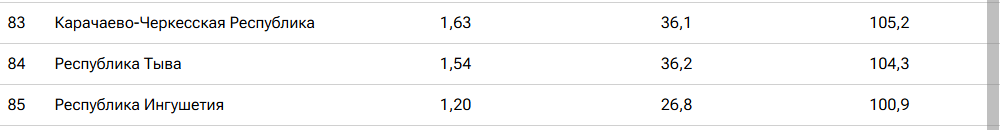 В аутсайдерах рейтинга: Карачаево-Черкесская Республика, Республика Тыва и Республика Ингушетия.