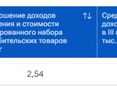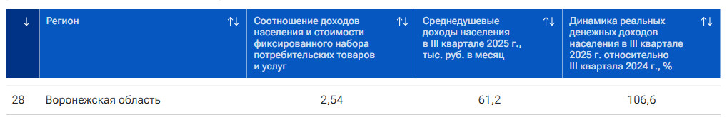 Соотношение доходов населения и стоимости фиксированного набора потребительских товаров и услуг составляет 2,54. Среднедушевые доходы жителей Воронежской области в третьем квартале 2025 года равняются 61,2 тыс руб в месяц. А динамика реальных денежных доходов населения в третьем квартале текущего года относительно третьего квартала 2024 года – 106,6%.