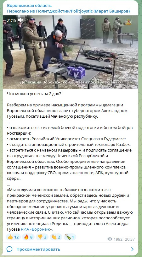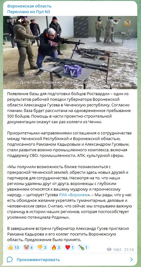 Более крупный телеграм-канал - «Пул №3» (287 тыс подписчиков) — написал примерно то же самое. Коротко и официозно: «Появление базы для подготовки бойцов Росгвардии – один из результатов рабочей поездки губернатора Воронежской области Александра Гусева в Чеченскую республику». И тоже со ссылкой на госСМИ «РИА Воронеж», как будто это было обязательным условием в ТЗ.