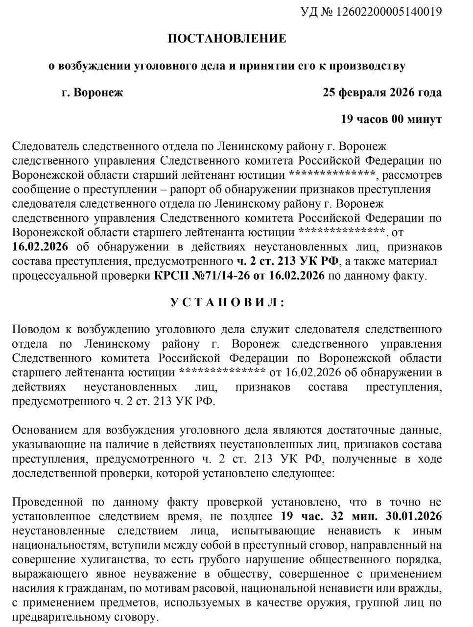 В документах Ленинского районного суда Воронежа есть материалы о том, что вышло постановление о возбуждении уголовного дела по ч. 2 ст. 213. То есть – о «Хулиганстве с применением оружия, совершенном группой лиц по предварительному сговору». В документах также указано, что сыновья участников СВО якобы напали на мигрантов на почве «расовой и национальной неприязни».