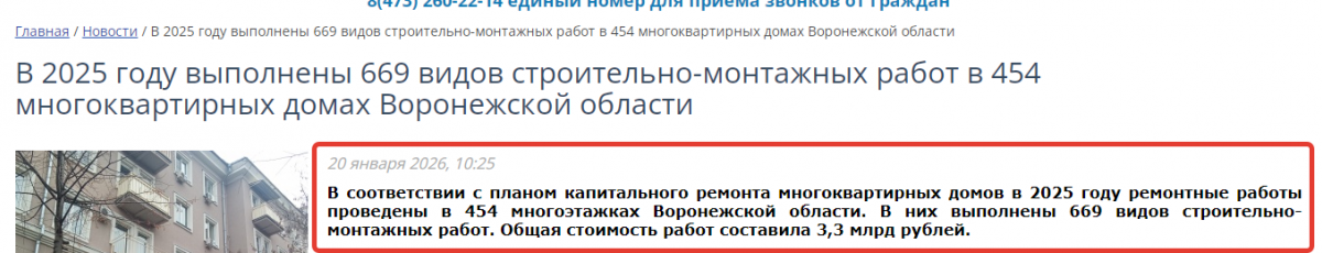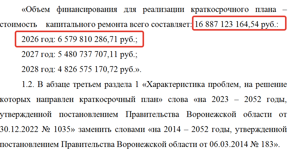 Все вышеприведенные цифры взяты из документов областного министерства ЖКХ и энергетики. Ведомство на днях опубликовало проект приказа по очередной корректировке региональной программы проведения "Капитального ремонта общего имущества в многоквартирных домах в Воронежской области на 2026 – 2028 годы". Документ еще официально не вступил в силу и проходит ряд обязательных «проверочных» процедур. Тем не менее приведенные в нем некоторые цифры обращают на себя внимание.