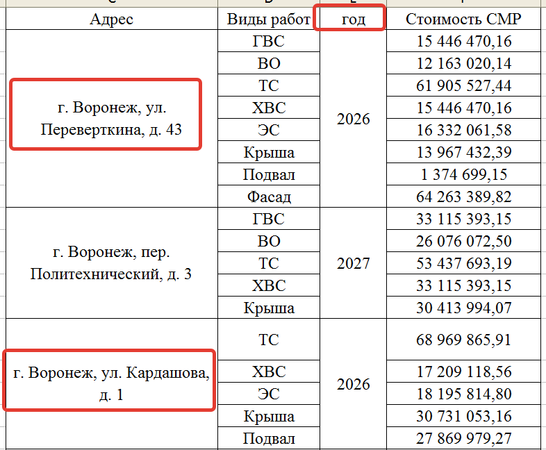 данные Фонда капитального ремонта Воронежской области, виды работ и стоимость в двух указанных домах в 2026 году
