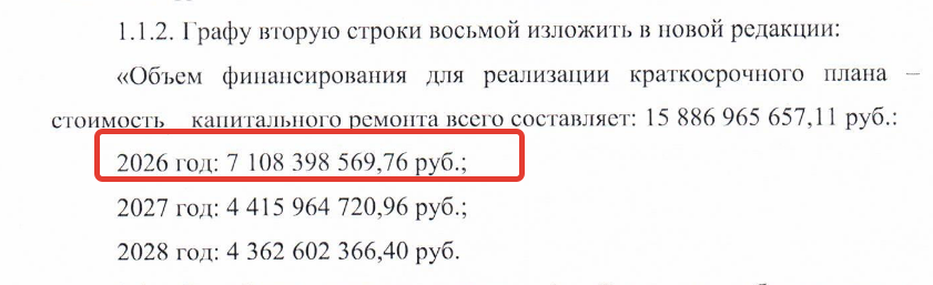 Если не считать январских праздников, то прошло всего пару месяцев, и программа на 2026 год серьезно секвестируется - почти на 530 млн рублей. Вместо ноябрьских цифр 7 млрд 108 млн рублей теперь планируется выделить на капремонт в наступившем году 6 млрд 579 млн.