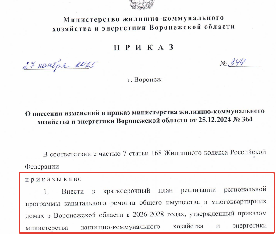 И еще интересный момент: в приказе министерства ЖКХ и энергетики, в новых поправках к программе трехлетнего капремонта (2026 – 2028 гг) общего имущества МКД в Воронежской области, в списке насчитывается 1106 объектов, МКД. Источник финансирования работ у всех указан один – средства собственников помещений.