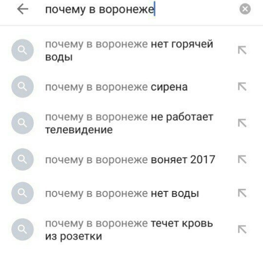 Согласно картинке, при наборе в поисковой странице "почему в Воронеже..." выдается немало интересных предложений. Так, поисковики предлагают узнать: почему в Воронеже воняет, почему не работает телевидение, почему течет кровь из розеток. Пользователи Сети сравнили Воронеж с Чернобылем на основании поисковых запросов.