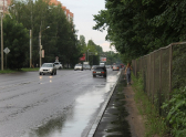 Кроме того, в непогоду указанный участок дороги пустеет. Потому что проколы под твердым покрытием, которое, кстати, местами повреждено и занесено песком, не успевают отводить дождевую воду. Быстро двигающиеся машины обдают грязью. Поэтому воронежцам часто приходится обходить препятствия либо по бордюру, либо по грязи.