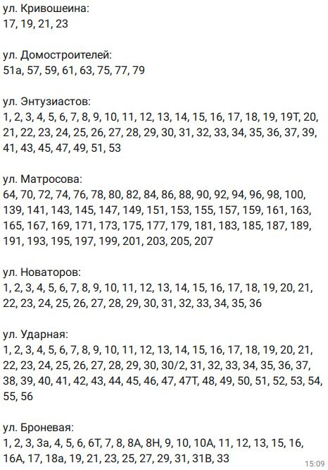 Вот, полный список домов, которых затронула коммунальная авария в ЖК «Адмирал»: