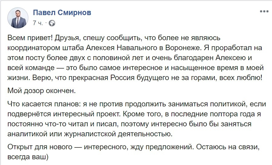 16 сентября стало известно, что координатор воронежского штаба Алексея Навального Павел Смирнов покинул свою должность. Об этом он рассказала на своей странице в Facebook, назвав прошедшие 2,5 года самым интересным и насыщенным временем в своей жизни. Также он заявил, что «прекрасная Россия будущего не за горами».