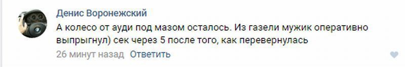 Очевидцы этой аварии рассказывают, что грузовая ГАЗель ударила иномарку «Ауди». От этого автомобиль бросило на проезжавший МАЗ, который та задела левым задним колесом. От подобного немецкий автомобиль перевернуло. Опрокинулась и грузовая ГАЗель. Однако ее водитель, по словам очевидцев, успел выпрыгнуть через несколько секунд, после того, как машину перевернуло.