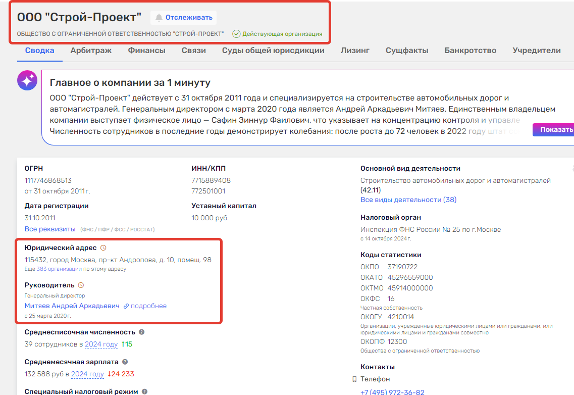скриншот из открытых данных о компании ООО "Строй-Проект", зарегистрированной в Москве