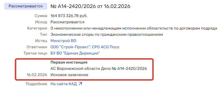 «Блокнот» продолжит следить за этой историей, тем более, что судебные баталии, в качестве истцов, будут вестись с обеих сторон. Как ранее сообщал «Блокнот», в ноябре 2025 года ООО «Строй-Проект» подало первое исковое заявление в арбитражный суд на воронежский минстрой. Экс-подрядчик требует с бывшего заказчика ни много, ни мало, а выплаты 92,4 млн рублей. По этому делу в среду 18 февраля был объявлен перерыв до 27 февраля.