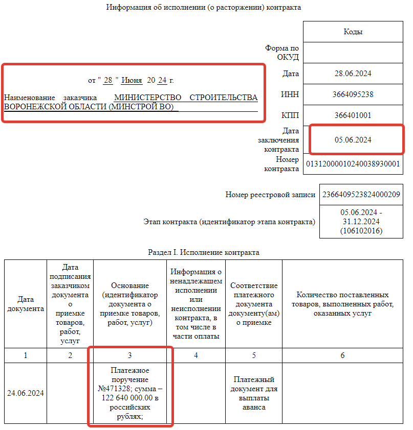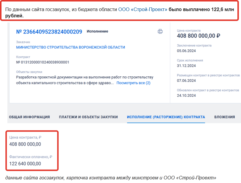 данные сайта госзакупок, оплата аванса ООО «Строй-Проект» от воронежского минстроя. На какую сумму он был отработан за 16 месяцев - нет данных, ни по одному акту выполненных работ