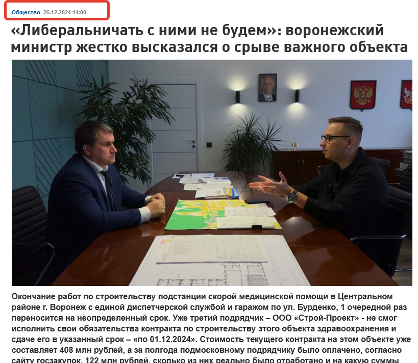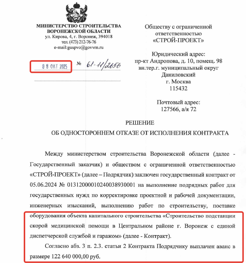Уже в конце сентября 2025 года минстрой решил направить на стройку «народный контроль», свою ведомственную организацию «Единая дирекция». Ее сотрудники несколько раз приезжали на объект и никого там не видели – ни рабочих, ни техники. В начале октября 2025 года воронежский минстрой принял решение об одностороннем отказа от исполнения контракта с ООО «Строй-Проект».