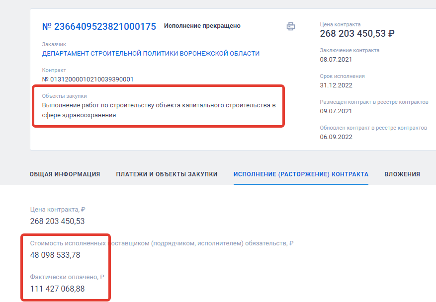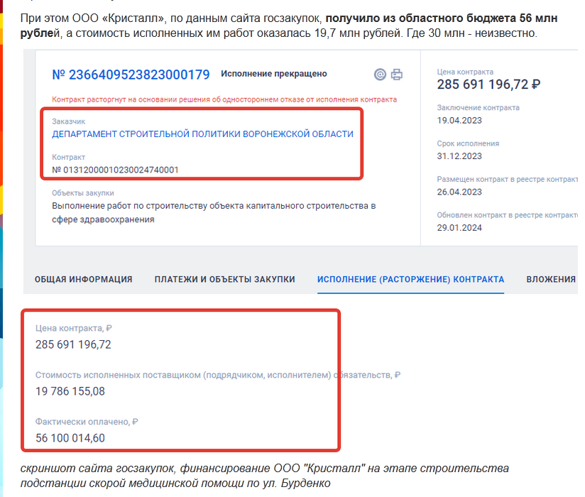 Вот и получается (63 млн + 36,4 млн ) почти 100 млн рублей из бюджета Воронежской области, которые неизвестно куда делись от двух подрядчиков при строительстве подстанции Скорой медицинской помощи по контрактам в 2021 - 2023 годах. Теперь к ним присоединяется третий неудачник.