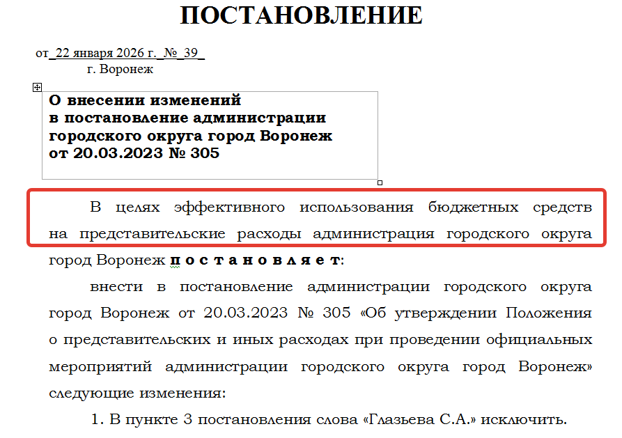 Почти на 40 процентов мэр Сергей Петрин увеличил затраты бюджета на представительские и иные расходы при проведении официальных мероприятий администрации городского округа город Воронеж. Норма представительских расходов увеличена (на одного человека) с прежних 5500 рублей до 7500 рублей. Об этом сообщается в постановлении городской администрации №39 от 22 января 2026 года, документ был официально опубликован накануне на сайте мэрии.