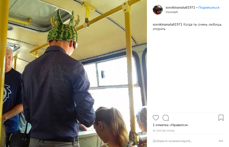 На этот раз горожанка Наталья увидела в «пазике» юношу, который выделялся из толпы за счет головного убора. В то время как в Воронеже парит зной, парень покрыл голову арбузом, а точнее его коркой, которая идеально подошло по своей форме к круглой части тела.