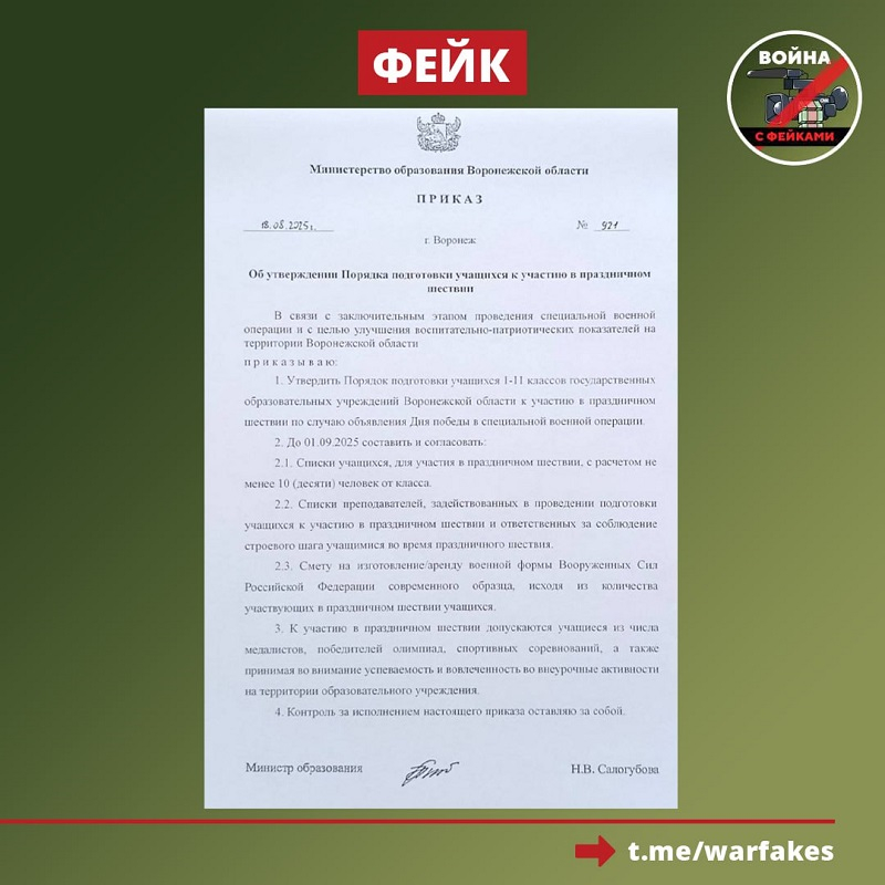 Приказ воронежского министерства о шествии школьников в честь победы в СВО признали фейком