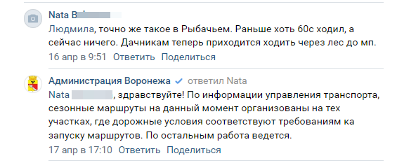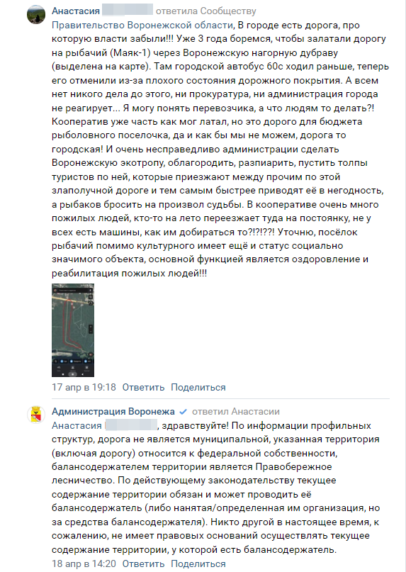 «Всем нет никого дела до этого, ни прокуратура, ни администрация города не реагирует... Я могу понять перевозчика, а что людям то делать?! Кооператив уже часть как мог латал, но это дорого для бюджета рыболовного поселочка, да и как бы мы не можем, дорога то городская. <…> В кооперативе очень много пожилых людей, кто-то на лето переезжает туда на постоянку, не у всех есть машины, как им добираться то?! Уточню, посёлок рыбачий помимо культурного имеет ещё и статус социально-значимого объекта, основной функцией является оздоровление и реабилитация пожилых людей», - пишет местная жительница в сообществе администрации Воронежа.