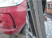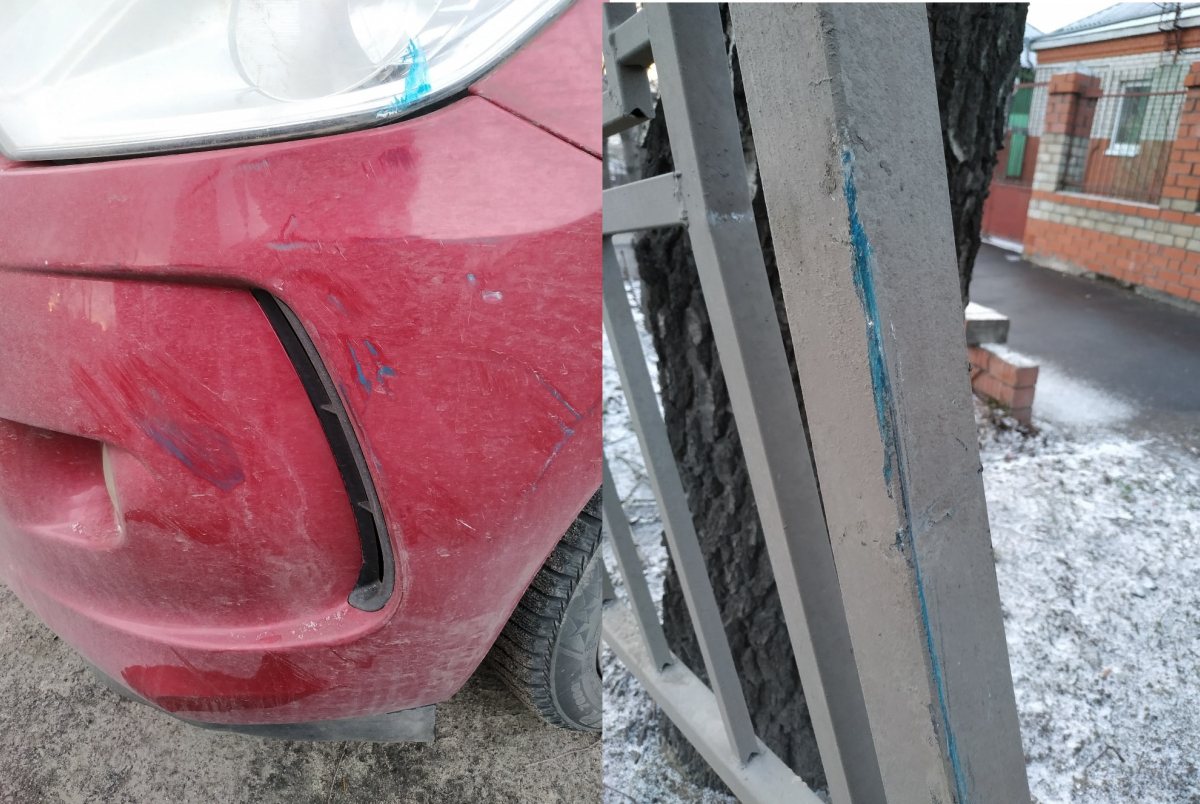 Пока автомобилист отсутствовал, неизвестный водитель протаранил иномарку и забор, после чего скрылся с места ДТП. На кузове авто и металлоконструкции остались следы синей краски.