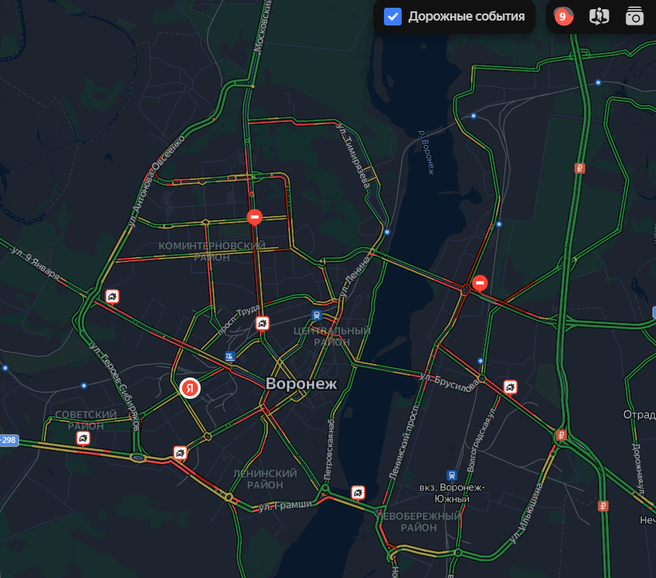 Утром 13 сентября Воронеж замер. На дорогах в час пик наблюдаются пробки в девять баллов. Дождь, аварии и перекрытые участки – все это привело к заторам.