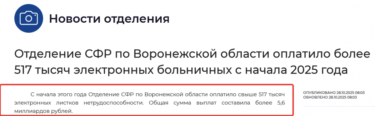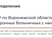 С начала этого года отделение Социального Фонда РФ по Воронежской области оплатило свыше 517 тысяч электронных листков нетрудоспособности. Общая сумма выплат составила более 5,6 млрд рублей. Эти данные опубликованы на сайте Отделения СФР по Воронежской области 28 октября.