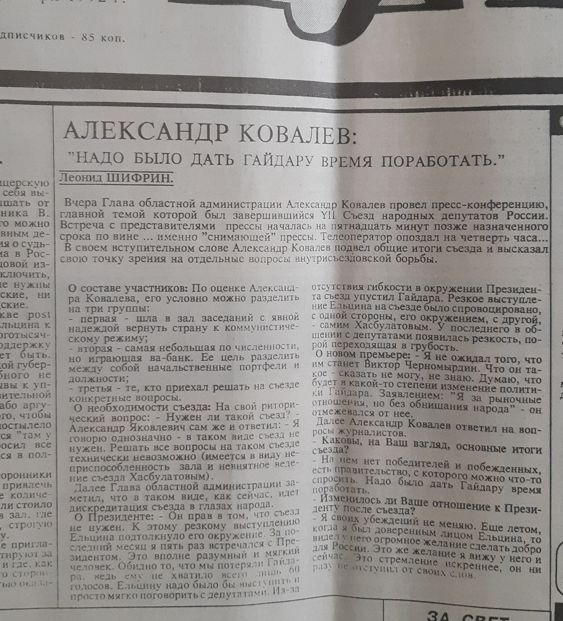 На VII Съезде народных депутатов, с которого начинался Конституционный кризис в стране, присутствовал губернатор Воронежской области Александр Ковалев. Вернувшись затем в наш регион, он выступил перед журналистами, где обозначил основные итоги того события.