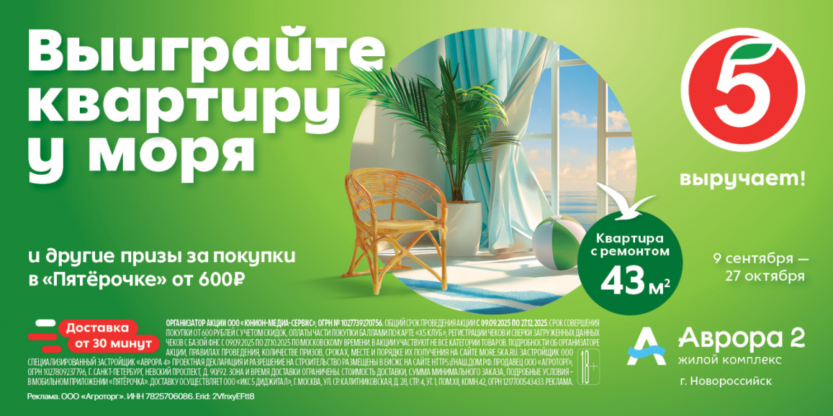 Торговая сеть «Пятёрочка» объявляет о запуске акции «Выиграйте квартиру у моря». Главный приз — квартира в Новороссийске, которая станет для победителя воплощением мечты о собственном жилье на побережье.