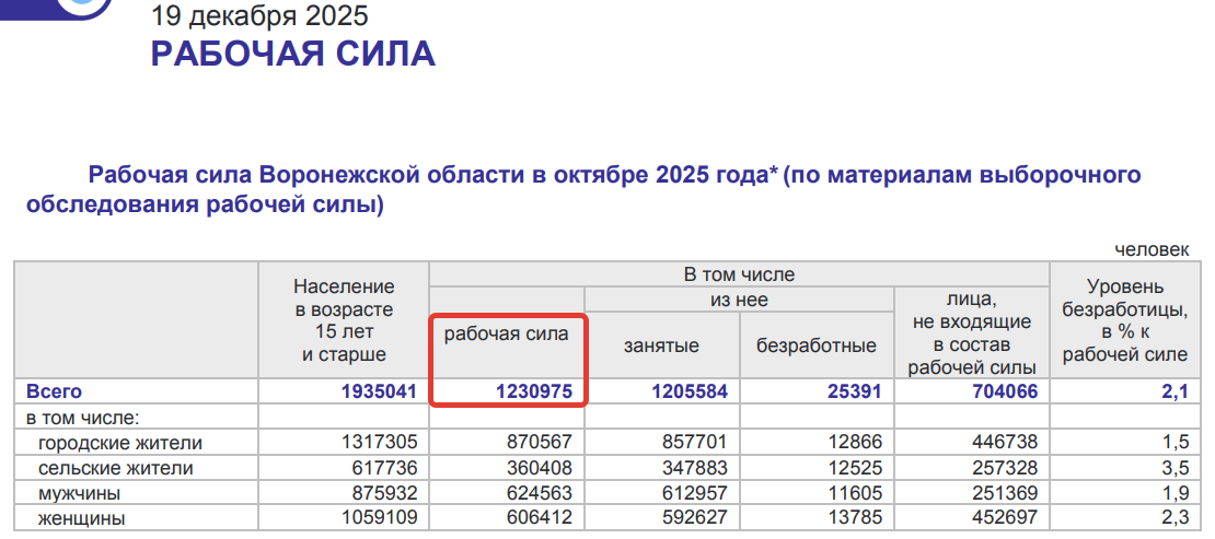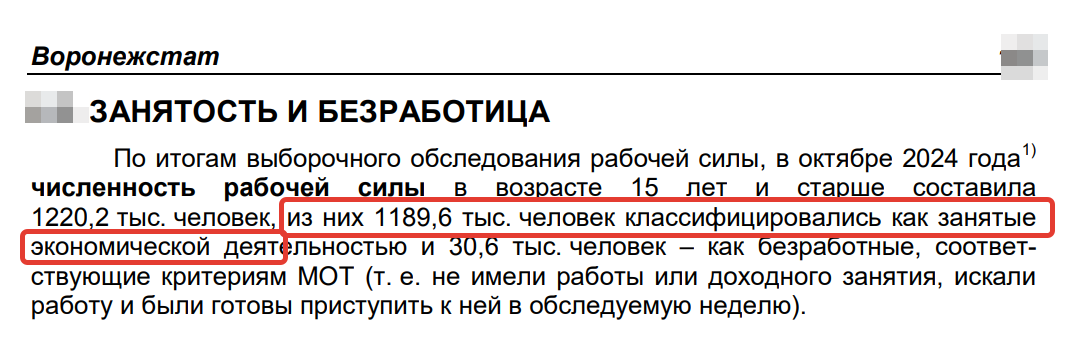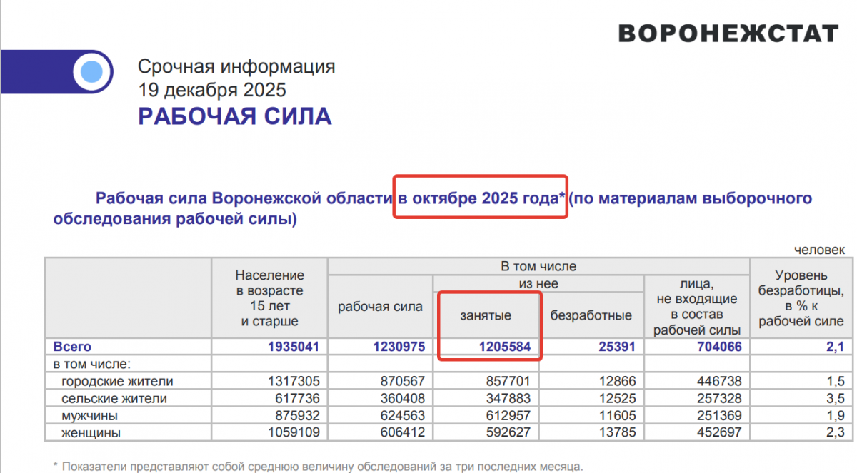 Но другой источник, Воронежстат, в прошлую пятницу сообщил, что этот показатель на октябрь 2025 года составляет 1 млн 205 тысяч человек, то есть данные по занятым в экономике «не стыкуются» на 53 тысячи человек. «Статистическая погрешность» при расчетах одного показателя уж очень «жирная».