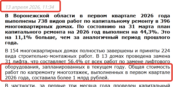 скриншот из новостей (от 13.04. 2026) на сайте Фонда капитального ремонта МКД Воронежской области