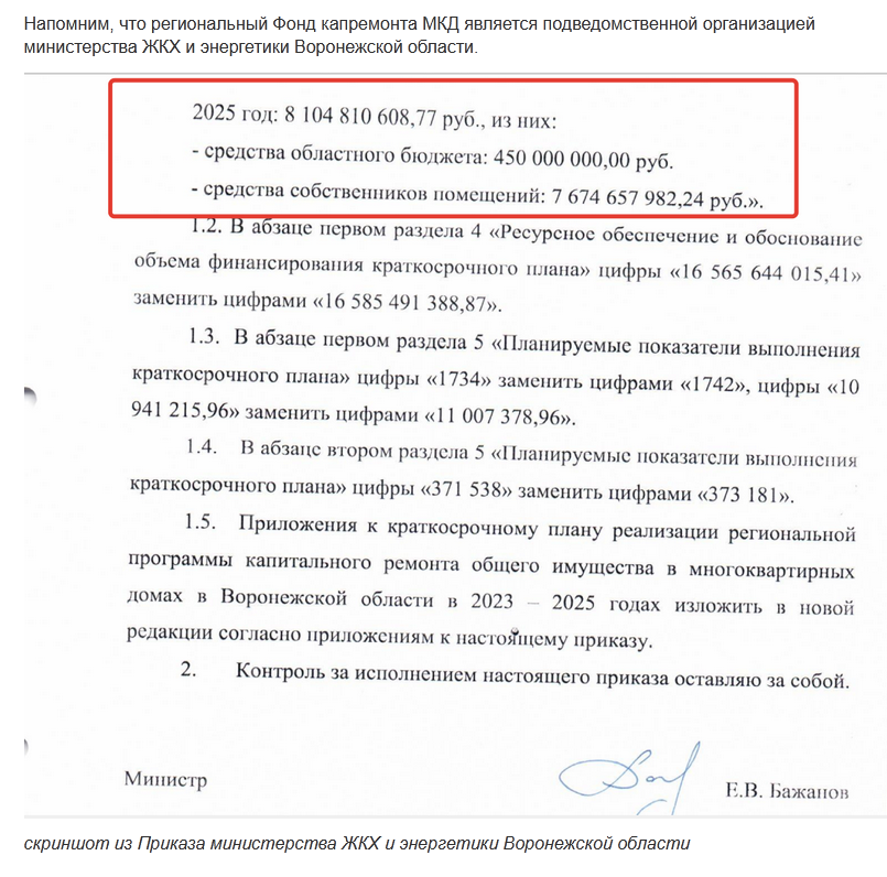 Как так могло получиться, что в приказе областного министерства ЖКХ и энергетики от декабря 2025 года (документ с подписью министра имеется у автора) записана цифра – объем финансирования краткосрочного плана капремонта в 2025 году – в 8 млрд 104 млн рублей, где средства собственников помещений – почти 7,7 млрд.