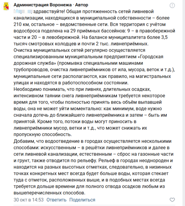 После обильных (и не только) осадков «Блокнот Воронеж» получает большое количество обращений на тему затопленных дорог, дворов, улиц. Например, от поездки по Космонавтов в сезон дождей лучше отказаться совсем. И тут встает вопрос о работоспособности ливневых канализаций. Вопрос ливневок на днях подняли и в официальном сообществе городской администрации.