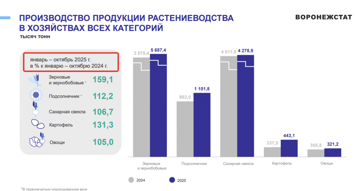 На 1 ноября, по данным Воронежстата, на полях было собрано 5 млн 687 тысяч тонн зерновых и зернобобовых культур, тогда как год назад – всего 3 млн 574 тысячи тонны. То есть есть рост в 2 млн тонн.