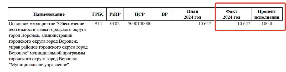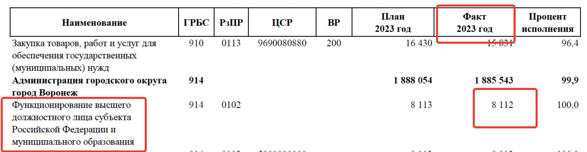 скриншот из отчета мэрии Воронежа об исполнении бюджета города в 2023-м году