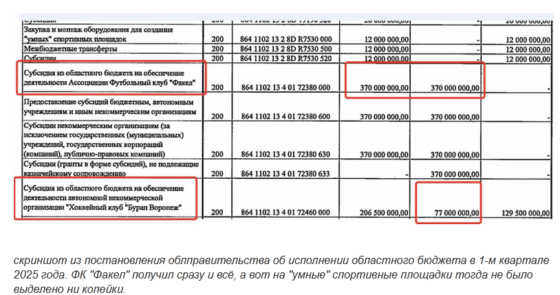 Куда более интересным выглядит такой факт, на который ранее обратил внимание «Блокнот»: весь размер бюджетной субсидии для «Факела» в сумме 370 млн рублей на 2025 год облправительство направило получателю еще в 1-м квартале (январь – март).
