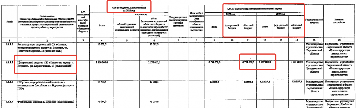 Согласно последним данным облправительства, его ОАИП на 2026 год, в ближайшие три года на строительство стадиона ФК "Факел" может быть потрачено 18 млрд 405 млн рублей. Хотя в предыдущем документе, ОАИП - 2025, были другие цифры. А именно: в ближайшие пару лет на возведение 25-тысячного футбольного стадиона предполагалось потратить из бюджета области: 6 млрд 791 млн рублей + 8 млрд 107 млн = 14 млрд 895 млн рублей. С учетом объявленных расходов (в областной адресной инвестпрограмме на 2025 г.) в уходящем году в сумме 2 млрд 107 млн рублей, общие затраты бюджета области за эти три года могли составить 16 млрд 995 млн.