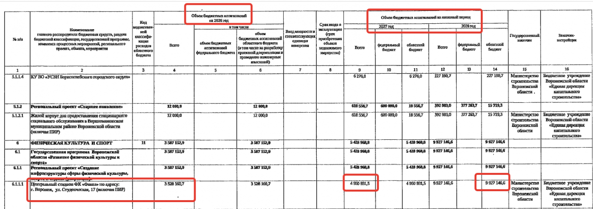 Расходы бюджета Воронежской области на начало строительства в 2026 году второго стадиона ФК «Факел» могут составить 3 млрд 528 млн рублей, в 2027- м - почти 5 млрд рублей, а в 2028-м - около 10 млрд рублей. Такие цифры содержатся в постановлении правительства - "Об утверждении областной адресной инвестиционной программы по объектам государственной (областной) собственности на 2026 год и на плановый период 2027 и 2028 годов". Этот документ был официально опубликован во вторник, 30 декабря.